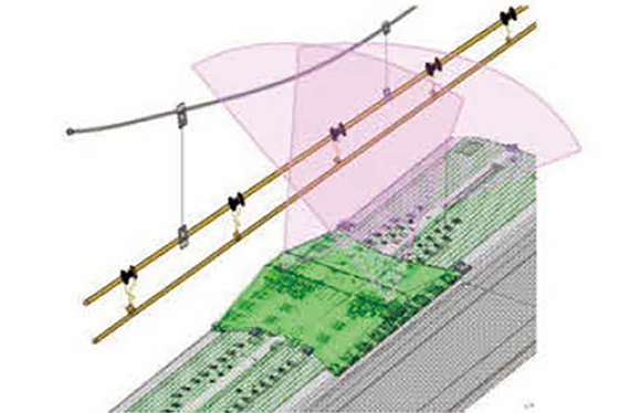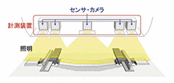 架線同士の位置関係や電車線金具などの架線細部については、開発した「架線三次元検測装置」「電車線金具異常検知装置」にて検査できます。本装置により架線交差部等の複雑な架線の位置関係を三次元的に測定して良否を自動判定することができるほか、電車線金具画像を取得して金具の変形や破損等の異常を自動で検出することができます。