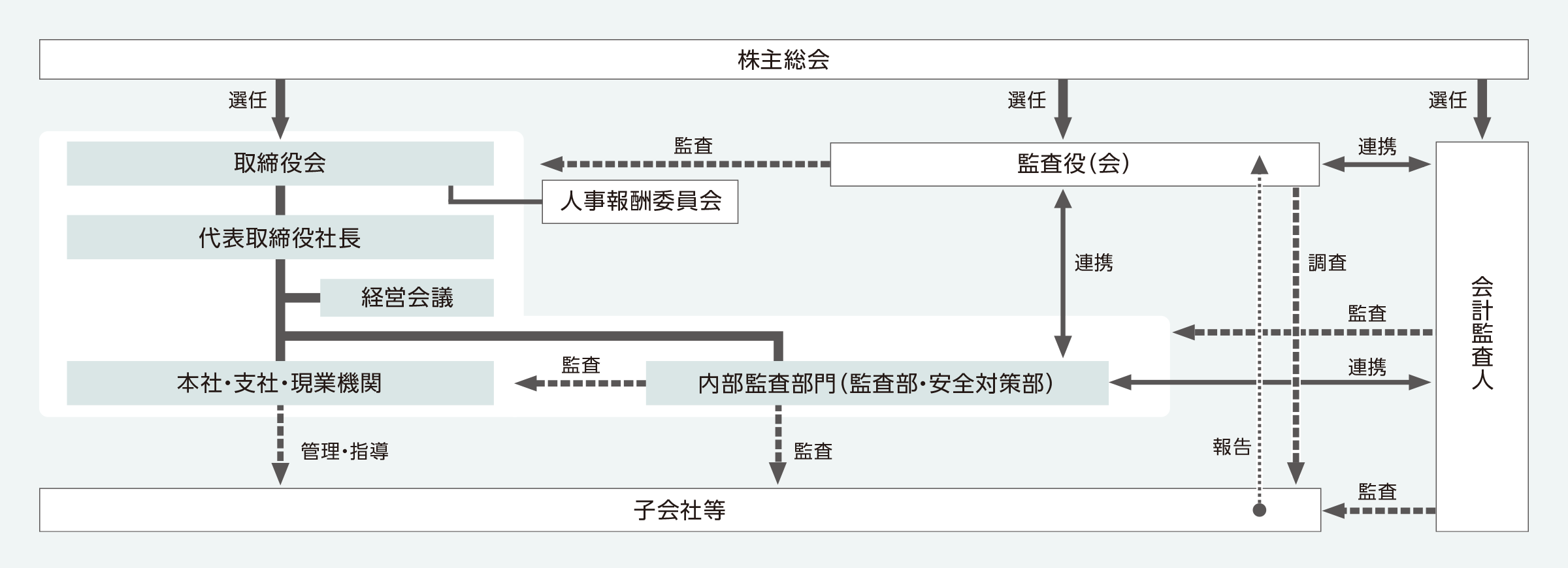 内部監査は、監査部において、業務運営の準拠性、効率性及び有効性の観点から、当社及び主要な子会社等の業務全般を対象として、業務資料や契約書等の書類の確認、作業実態の確認、関係者へのインタビューなどの手法により監査を実施し、その結果を経営者に報告しています。加えて、安全対策部において、運転事故及び労働災害を防止するため、安全監査を実施し、その結果を経営者に報告しています。